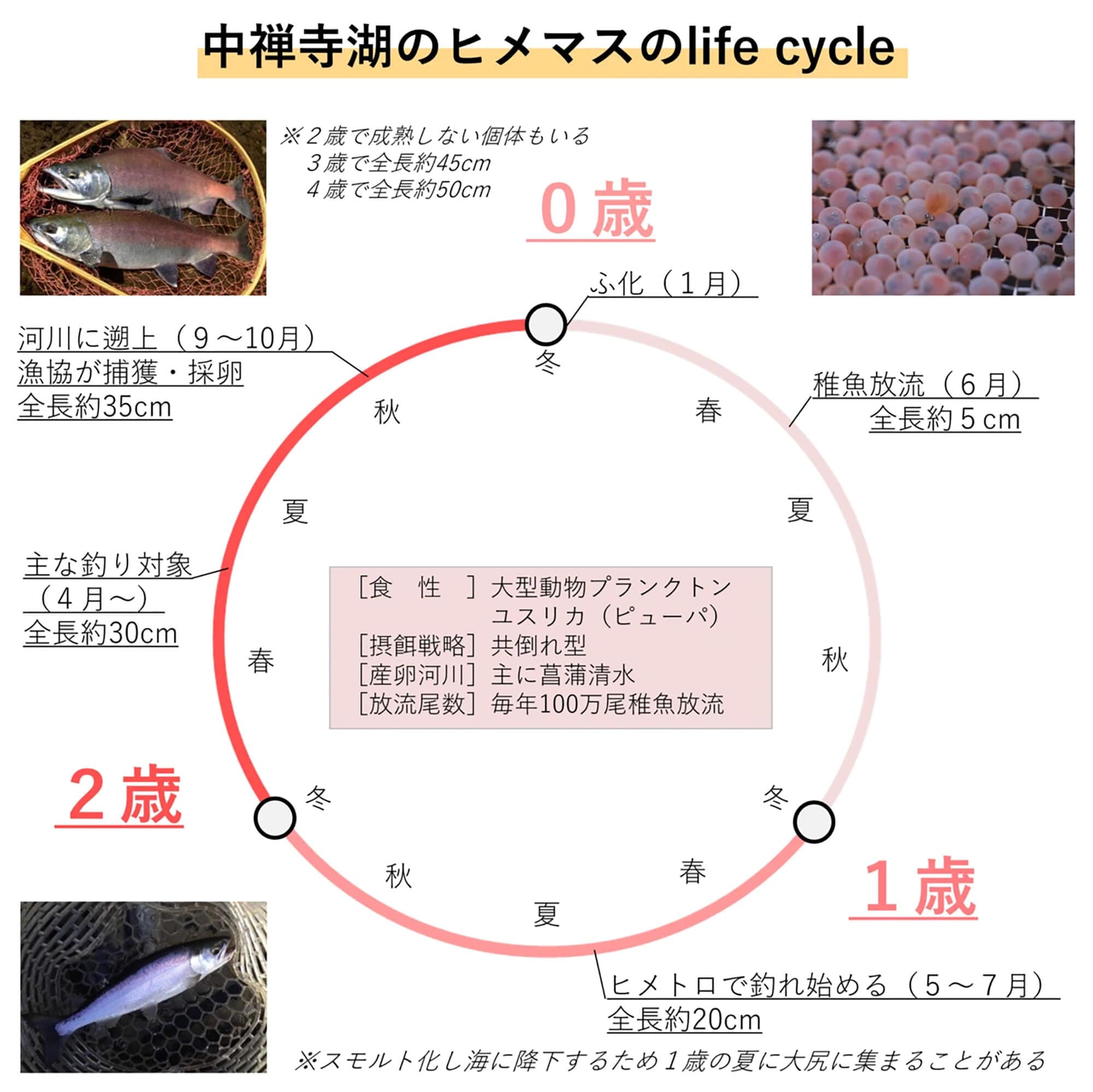 さて、その発眼卵放流も去年で3回目となりました。ヒメマスは母川回帰性が強く、約2年の間湖を回遊しその多くが生まれた川へ帰ってくると言われています。僕らが卵を埋めた柳沢川ベビーは柳沢川へ、漁協が育てた菖蒲ヶ浜ベビーは菖蒲ヶ浜へ。